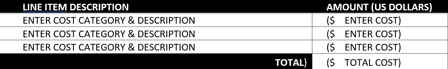 Provide specific line items from the budget narrative above. You may include any cost categories, including contingencies for risk mitigation, that support the development of your technology and payload. (NOTE: Although the award amount is up to $500,000, this amount may be more than, less than, or equal to that value).