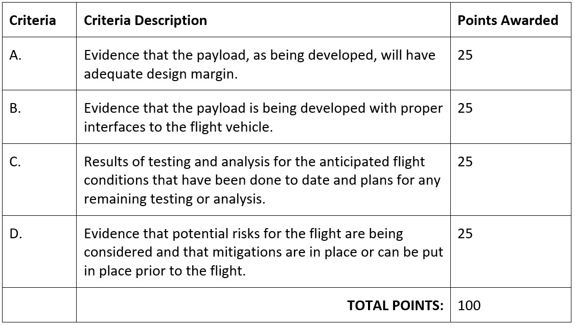 Upon successful completion of Payload Build Round 1, Winners will have the opportunity to compete for an additional award of $100,000 each in Payload Build Round 2. Winners will participate in a conference call to present their progress to date on their plans for the payload development. Field Judges will conduct an on-site visit in June 2022 to score the progress each Winner has made. The scoring criteria for Round 2 is as follows: